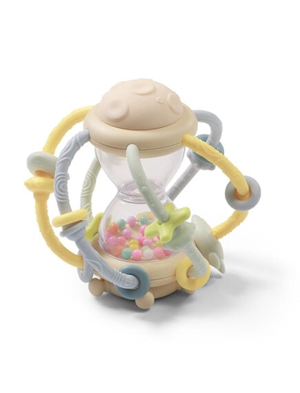 Μέσα στην κουδουνίστρα υπάρχει μια διάφανη κλεψύδρα με χρωματιστές χάντρες που κινούνται καθώς το μωρό κουνάει το παιχνίδι. Το οπτικό αυτό εφέ τραβάει την προσοχή του μωρού και ενισχύει την παρατηρητικότητα και την κατανόηση σχέσης αιτίας-αποτελέσματος.