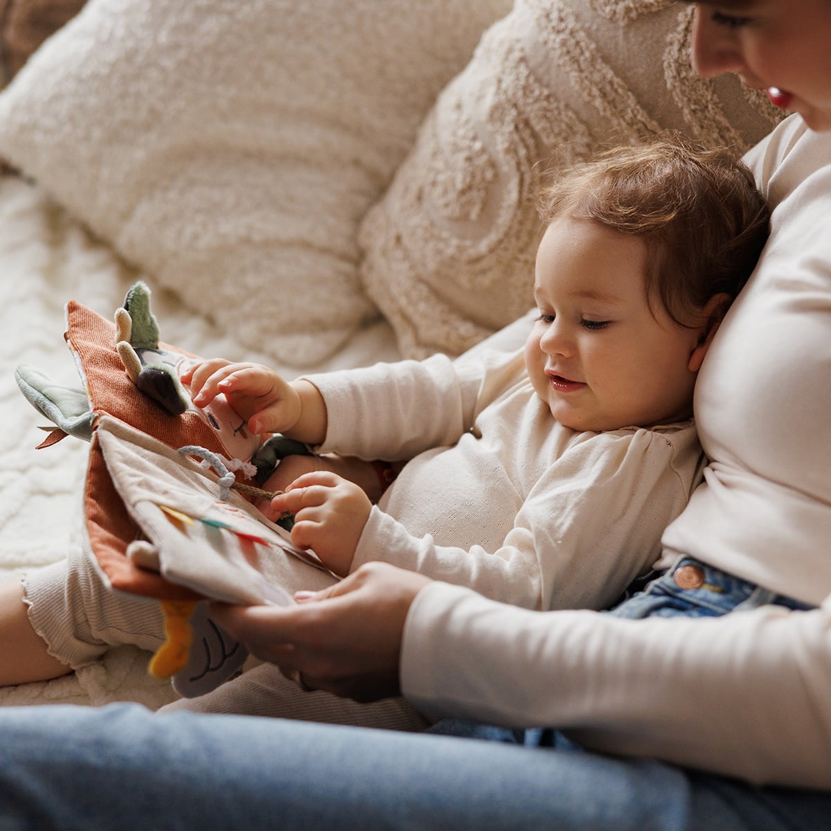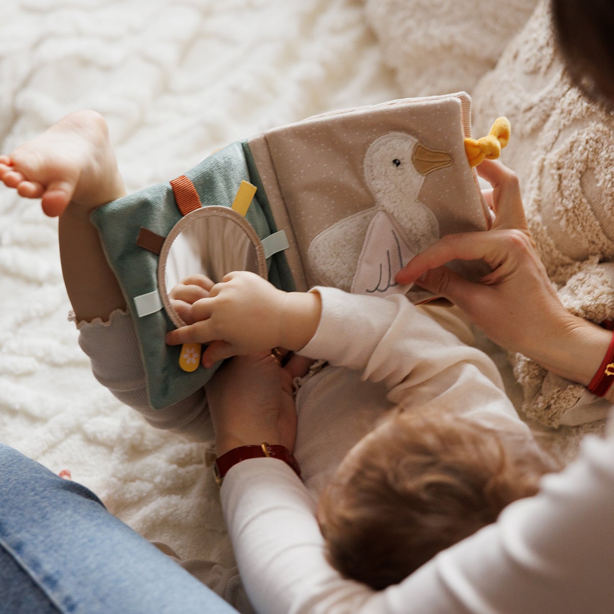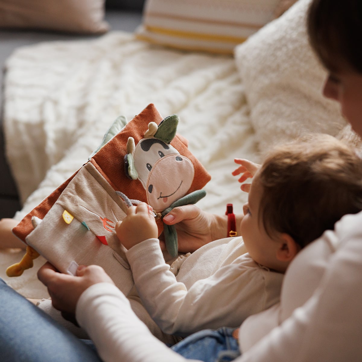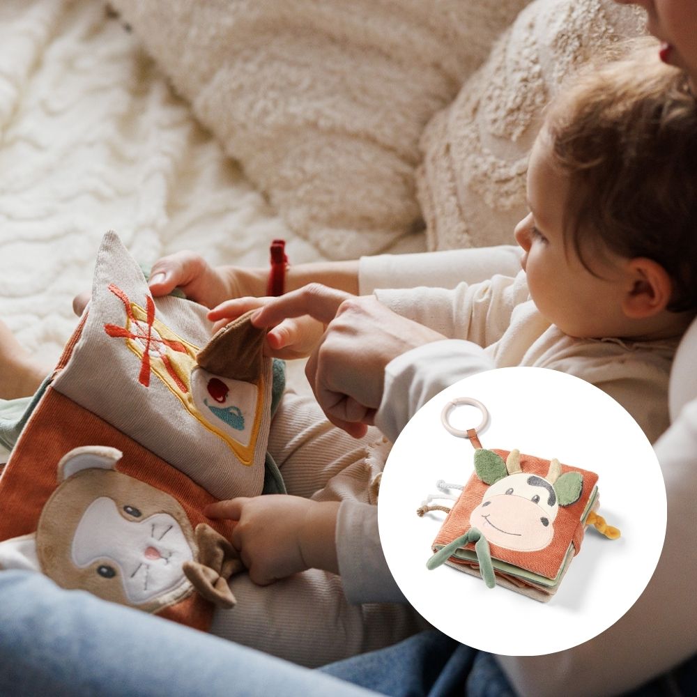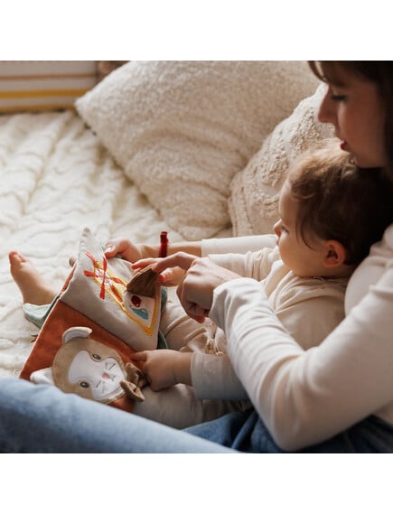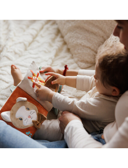 Διάφορες υφές, σχήματα, κουδουνίστρες, καθρεφτάκι και πολύχρωμες κορδέλες κρατούν το μωρό απασχολημένο και ενθαρρύνουν την εξερεύνηση και τη φαντασία.