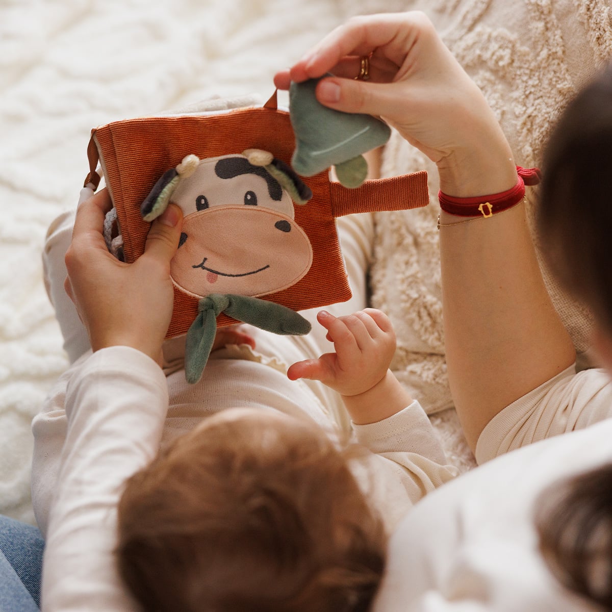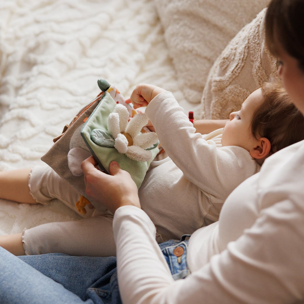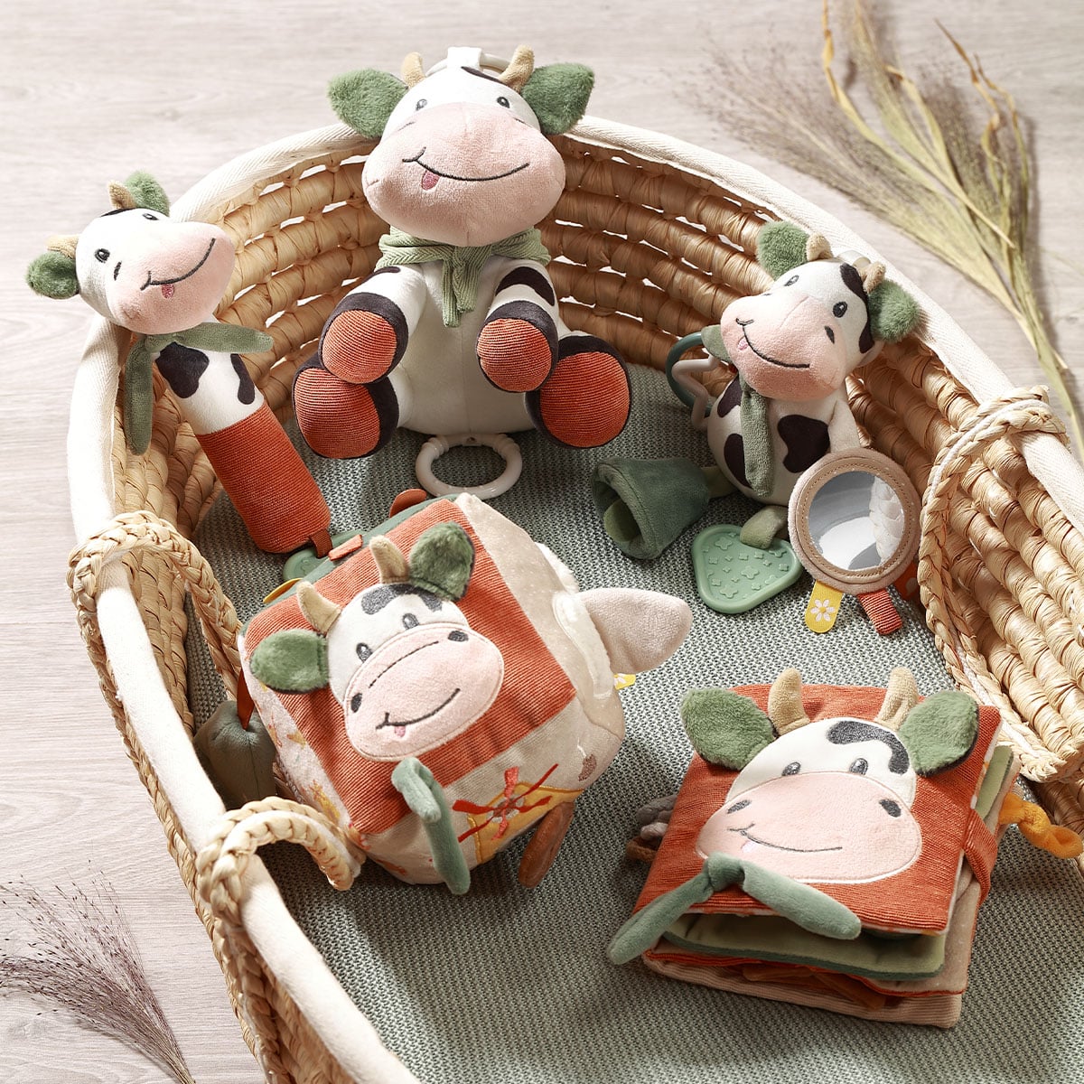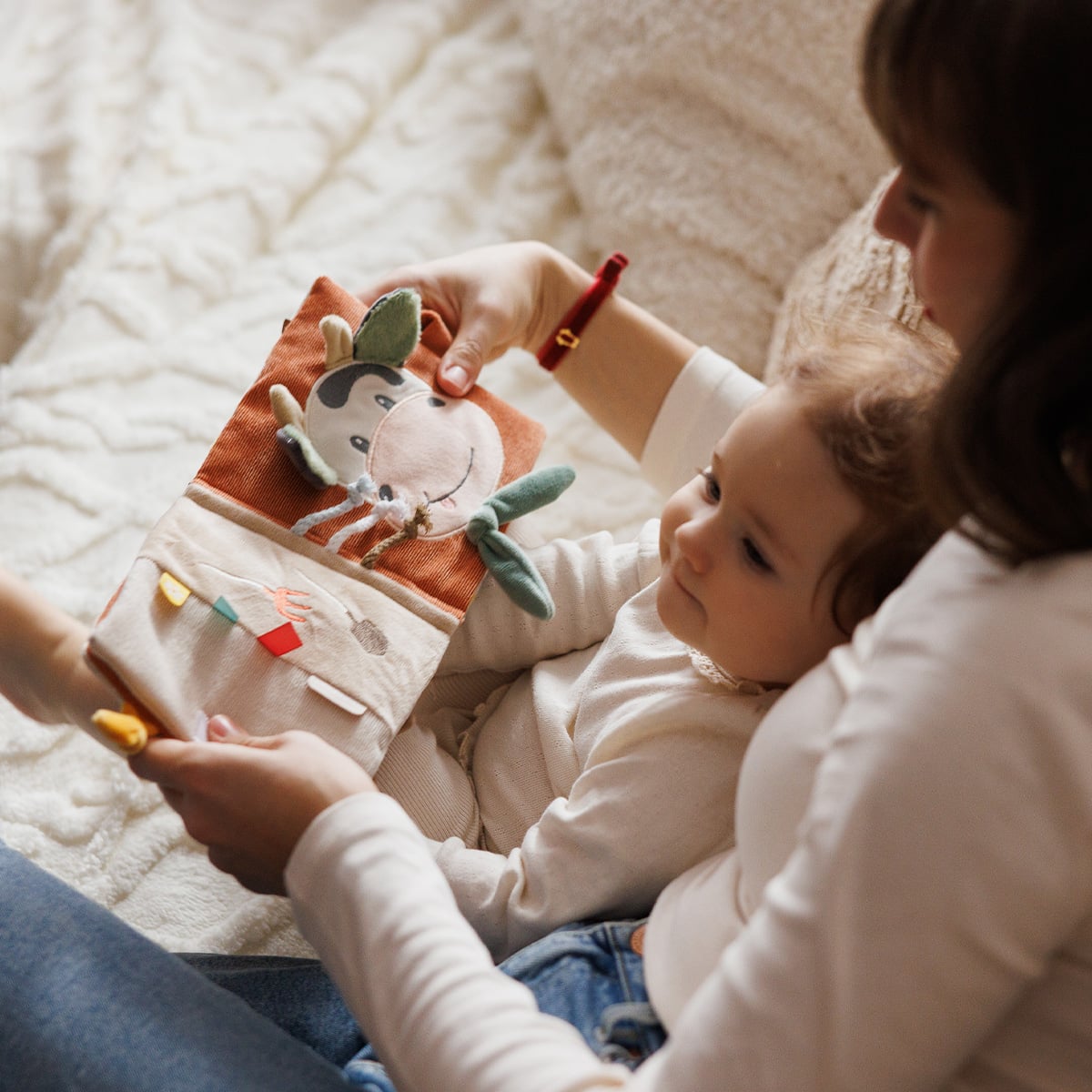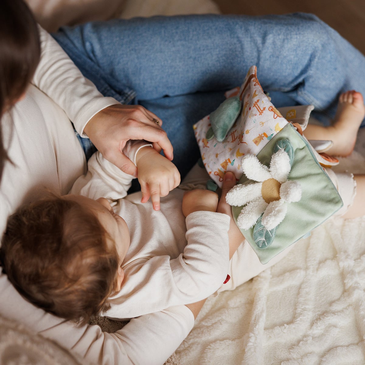 Διάφορες υφές, σχήματα, κουδουνίστρες, καθρεφτάκι και πολύχρωμες κορδέλες κρατούν το μωρό απασχολημένο και ενθαρρύνουν την εξερεύνηση και τη φαντασία.