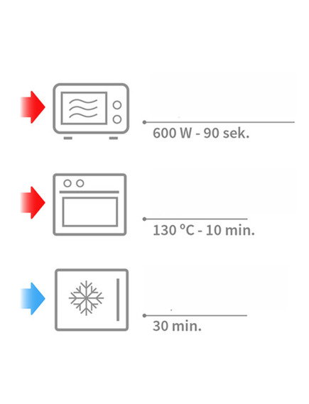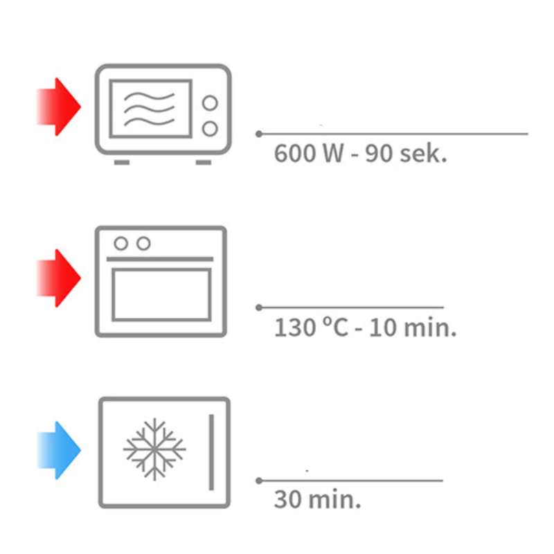- Αφαιρέστε το εξωτερικό κάλυμα και τοποθετήστε το σακουλάκι στο φούρνο μικροκυμάτων -> (600 W - 90 δευτερόλεπτα). Στον φούρνο -> (130° C - 10 λεπτά) ή στο καλοριφέρ μέχρι να ζεσταθεί πολύ καλά.