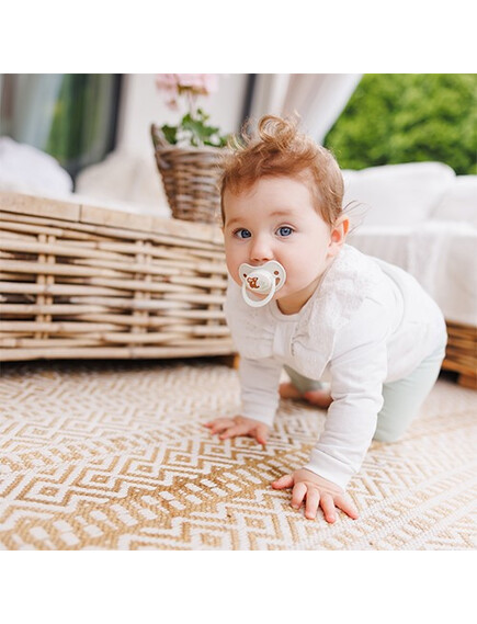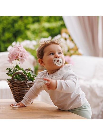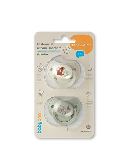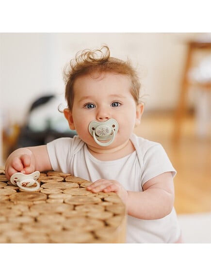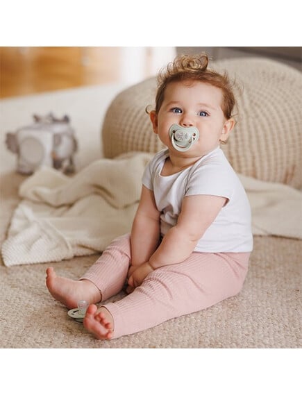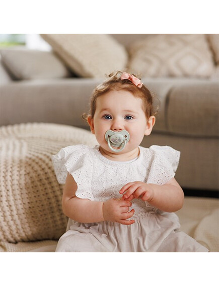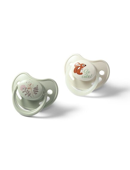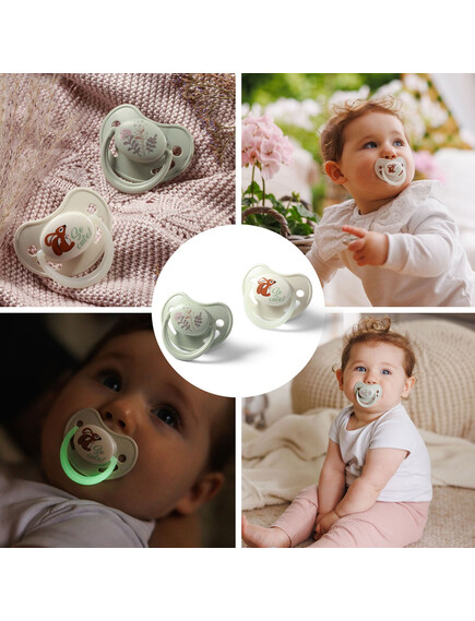 Το σετ περιλαμβάνει δύο πιπίλες – μία για την ημέρα και μία με φωσφορίζουσα λαβή για τη νύχτα. Η θηλή είναι κατασκευασμένη από υποαλλεργική σιλικόνη, χωρίς BPA και ανθεκτική στη φθορά.