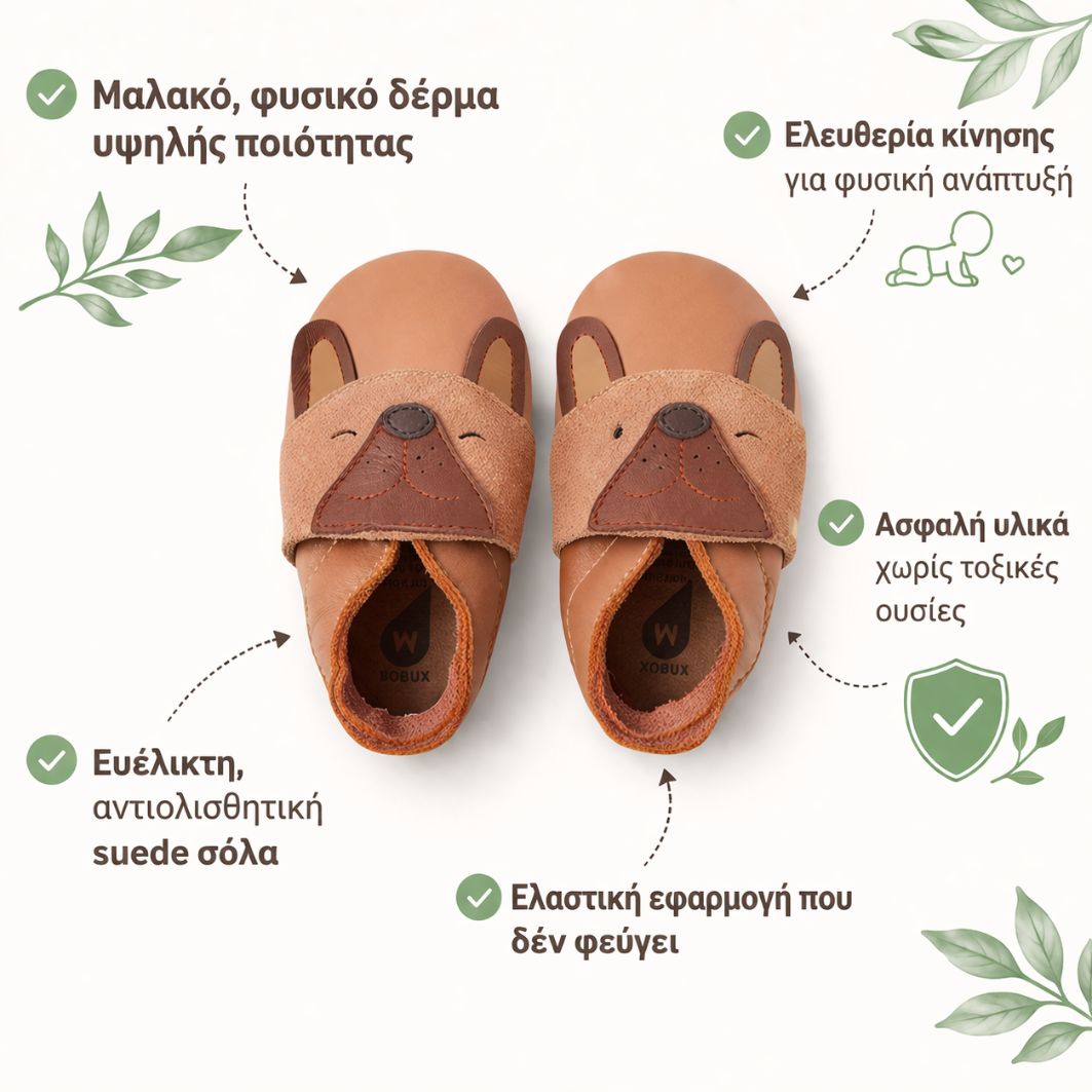 Άνεση & Φυσική Κίνηση Τα Bobux Soft Sole είναι σχεδιασμένα για τα πρώτα στάδια ζωής του μωρού, προσφέροντας ελευθερία κίνησης και φυσική ανάπτυξη. Το μαλακό δέρμα και η ευέλικτη κατασκευή επιτρέπουν στο ποδαράκι να κινείται φυσικά, χωρίς περιορισμούς.