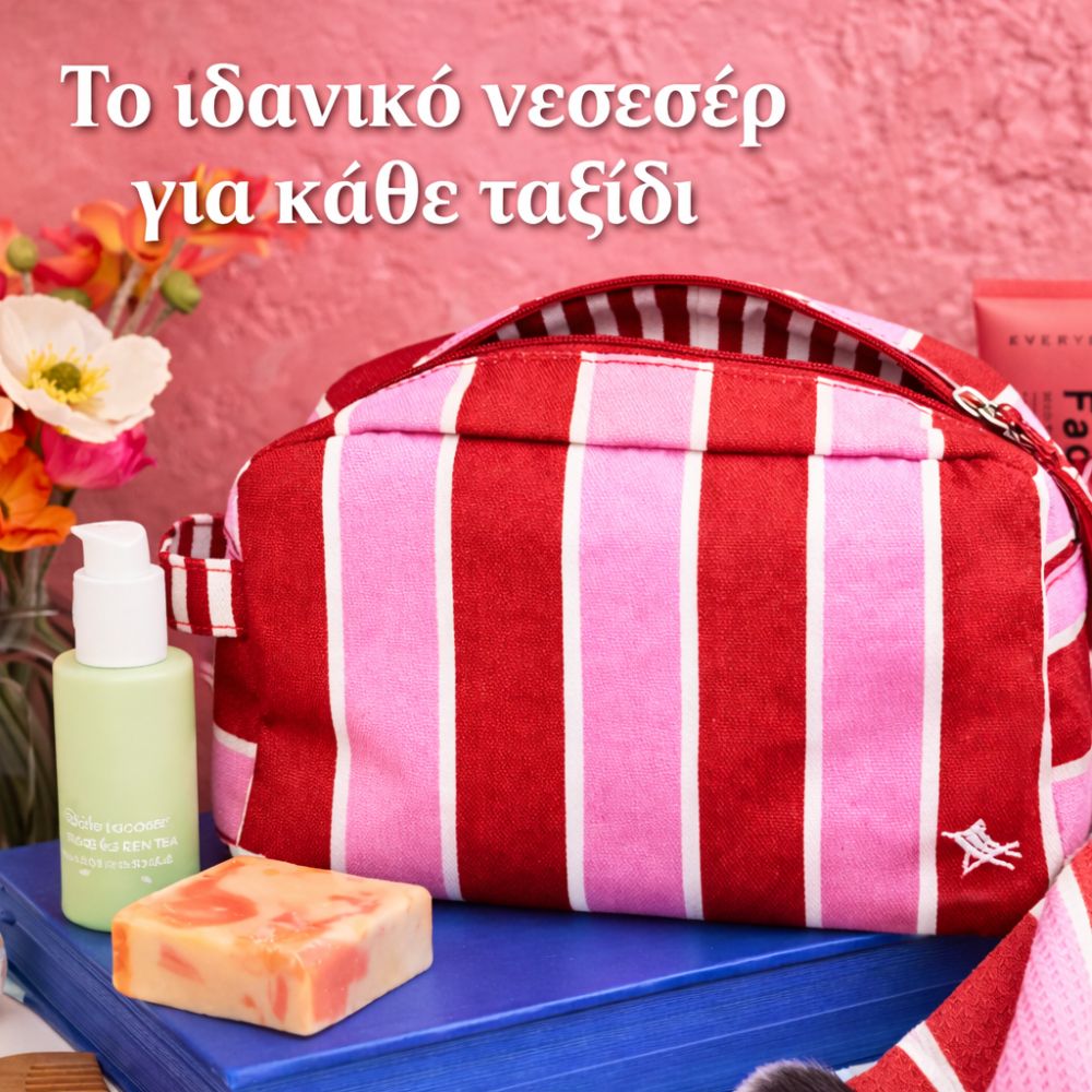 Με χώρο για την ενυδατική σου, το αντηλιακό, μακιγιάζ ή ό,τι άλλο χρειάζεσαι καθημερινά, όλα συγκεντρωμένα σε μία ανθεκτική και κομψή τσάντα. Με πρακτικό φερμουάρ και εύχρηστη λαβή για να την αρπάζεις και να φεύγεις… ακόμα κι όταν βιάζεσαι να προλάβεις την πτήση ✈️
