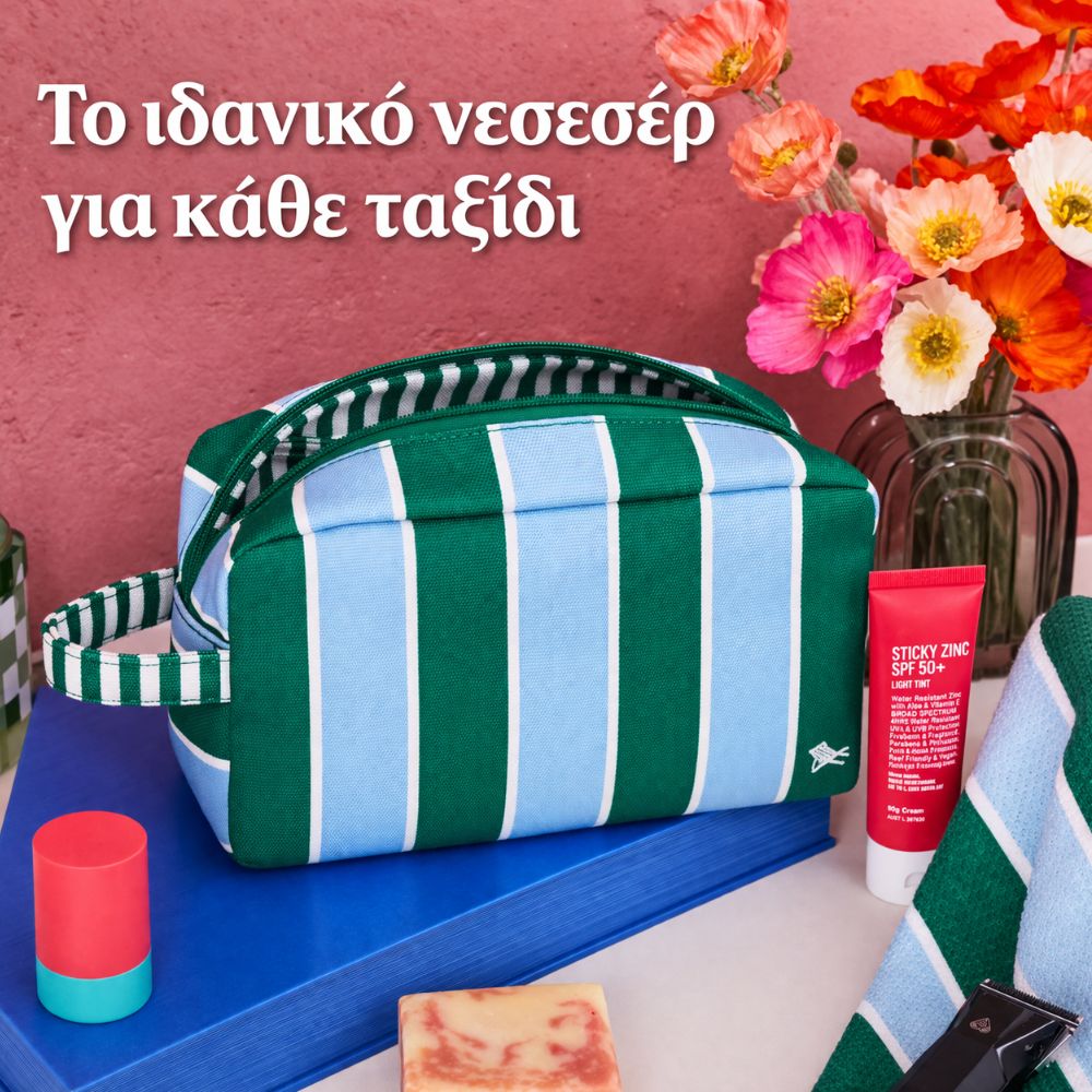 Με χώρο για την ενυδατική σου, το αντηλιακό, μακιγιάζ ή ό,τι άλλο χρειάζεσαι καθημερινά, όλα συγκεντρωμένα σε μία ανθεκτική και κομψή τσάντα. Με πρακτικό φερμουάρ και εύχρηστη λαβή για να την αρπάζεις και να φεύγεις… ακόμα κι όταν βιάζεσαι να προλάβεις την πτήση ✈️