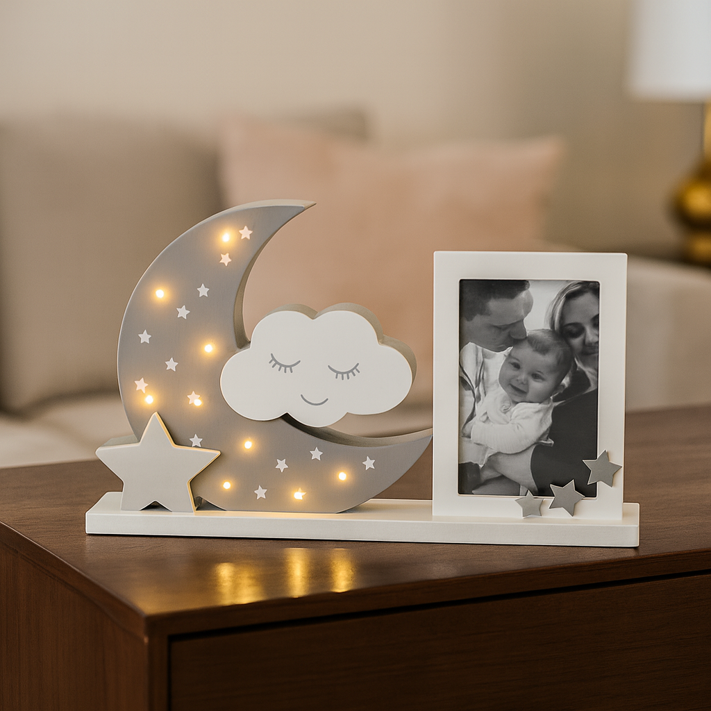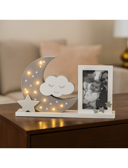 Το ιδιαίτερο με αυτή την κορνίζα είναι ότι το φεγγάρι περιέχει 9 μικρά φώτα LED, έτσι ώστε τα αστέρια να λάμπουν πραγματικά γύρω από το παιδί!