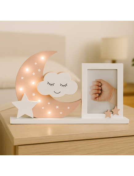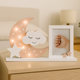Το ιδιαίτερο με αυτή την κορνίζα είναι ότι το φεγγάρι περιέχει 9 μικρά φώτα LED, έτσι ώστε τα αστέρια να λάμπουν πραγματικά γύρω από το παιδί!