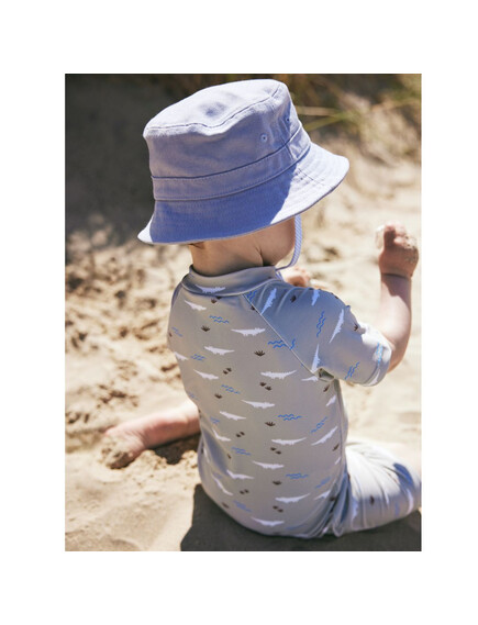 Αυτό το υφασμάτινο παιδικό καπέλο τύπου bucket καλύπτει το μεγαλύτερο μέρος του κεφαλιού ενώ διαθέτει περιμετρικό γείσο. Παρέχει προστασία από τη βλαβερή ηλιακή ακτινοβολία (UVA-UVB), φροντίζοντας αποτελεσματικά το δέρμα του παιδιού σας.