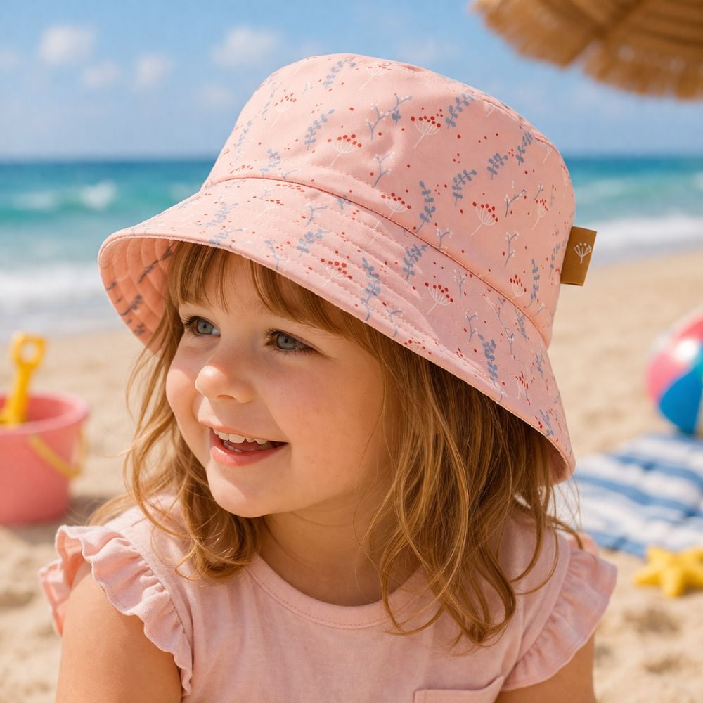 Αυτό το υφασμάτινο παιδικό καπέλο τύπου bucket καλύπτει το μεγαλύτερο μέρος του κεφαλιού ενώ διαθέτει περιμετρικό γείσο. Παρέχει προστασία από τη βλαβερή ηλιακή ακτινοβολία (UVA-UVB), φροντίζοντας αποτελεσματικά το δέρμα του παιδιού σας.