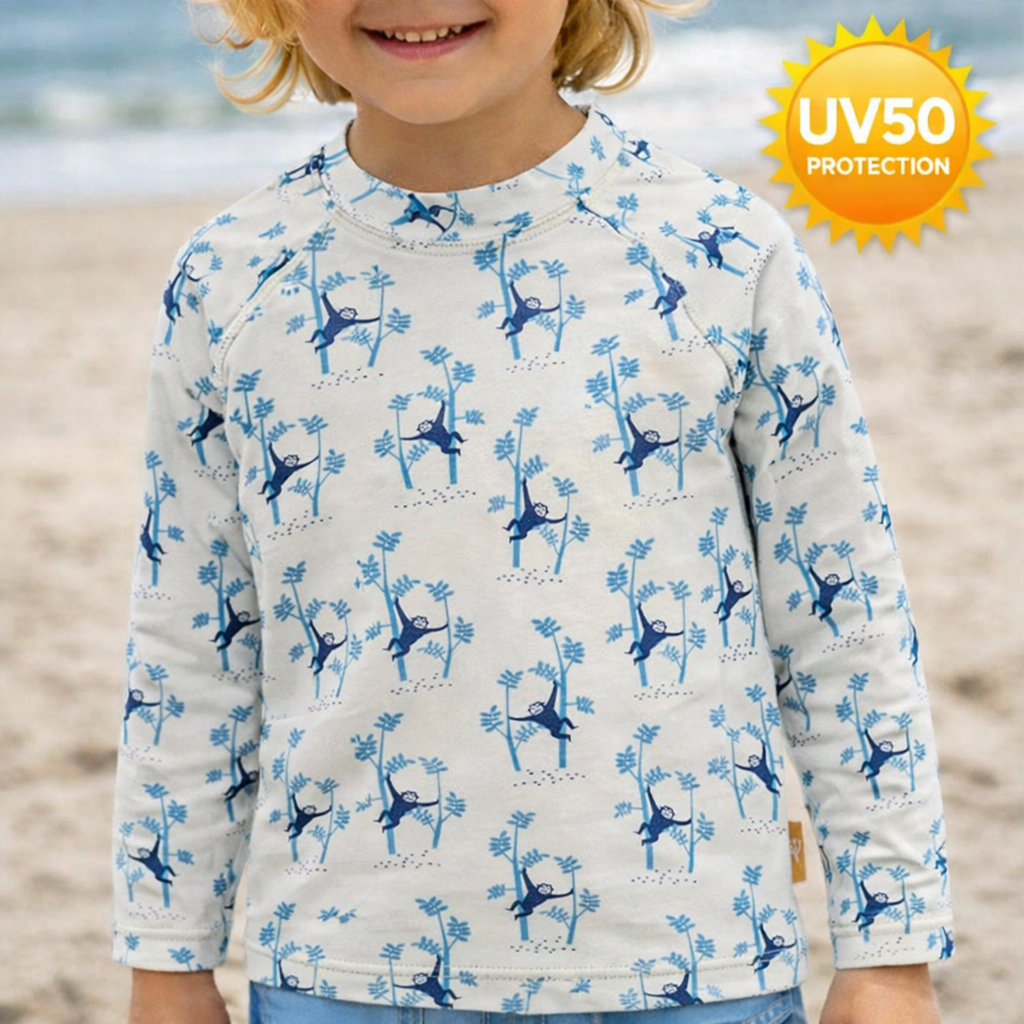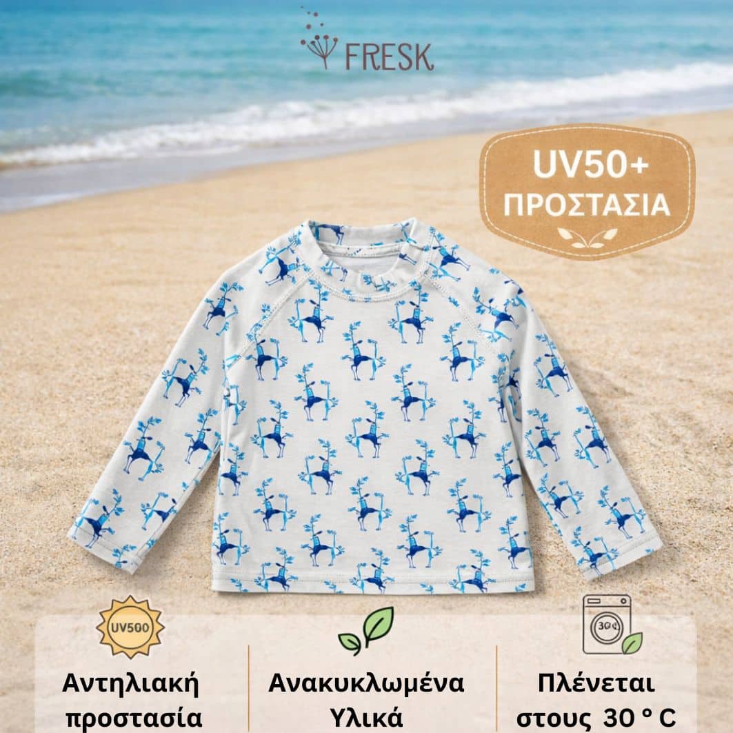 Με την μακρυμάνικη μπλούζα-μαγιό της Fresk, το μικρό σου μπορεί να παίζει άνετα στη θάλασσα ή την πισίνα, χωρίς να σε αγχώνει ο ήλιος.