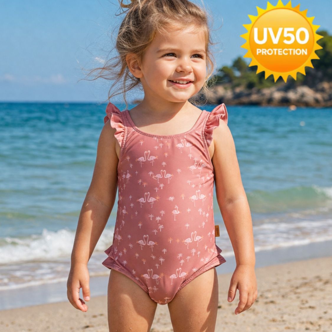 Τα γλυκά βολάν στις τιράντες και τους γοφούς, καθώς και το υπέροχο σχέδιο, κάνουν το μαγιό να ... τραβάει τα βλέμματα! Σε συνδυασμό με την εμφάνιση, το μαγιό προσφέρει UV50 και προστατεύει το παιδί από τον ήλιο.