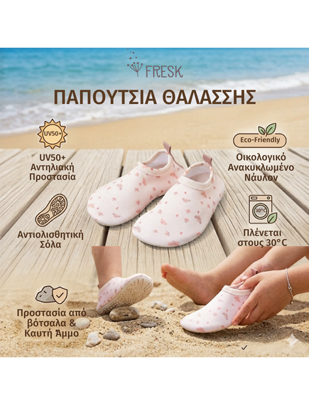 Τα παπούτσια θαλάσσης της Fresk διαθέτουν αντιολισθητική σόλα και εξασφαλίζουν σταθερό και γερό πάτημα στα παιδιά.