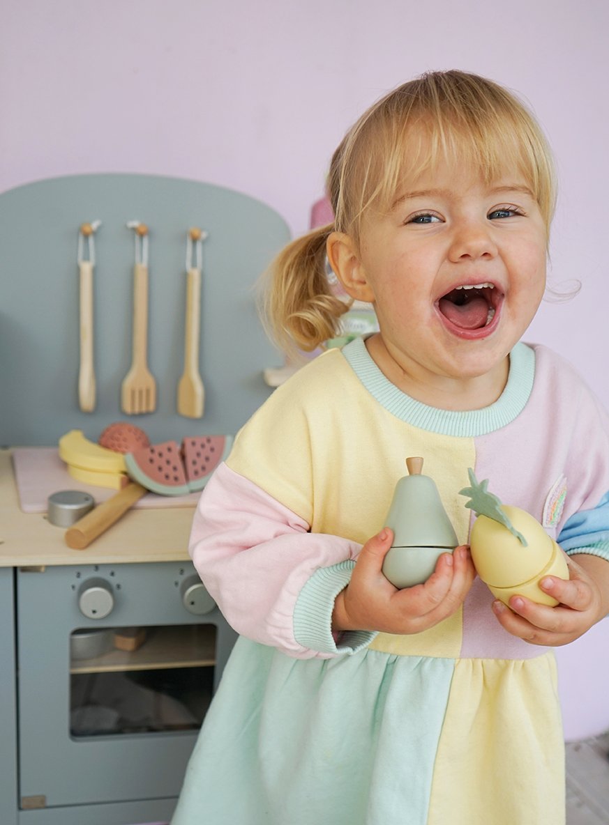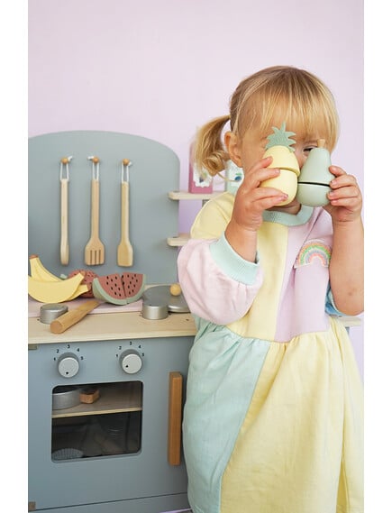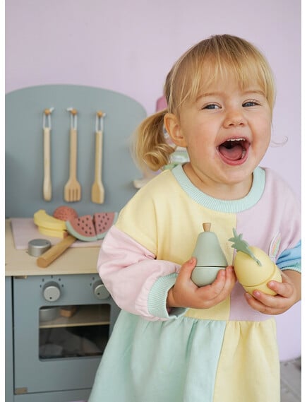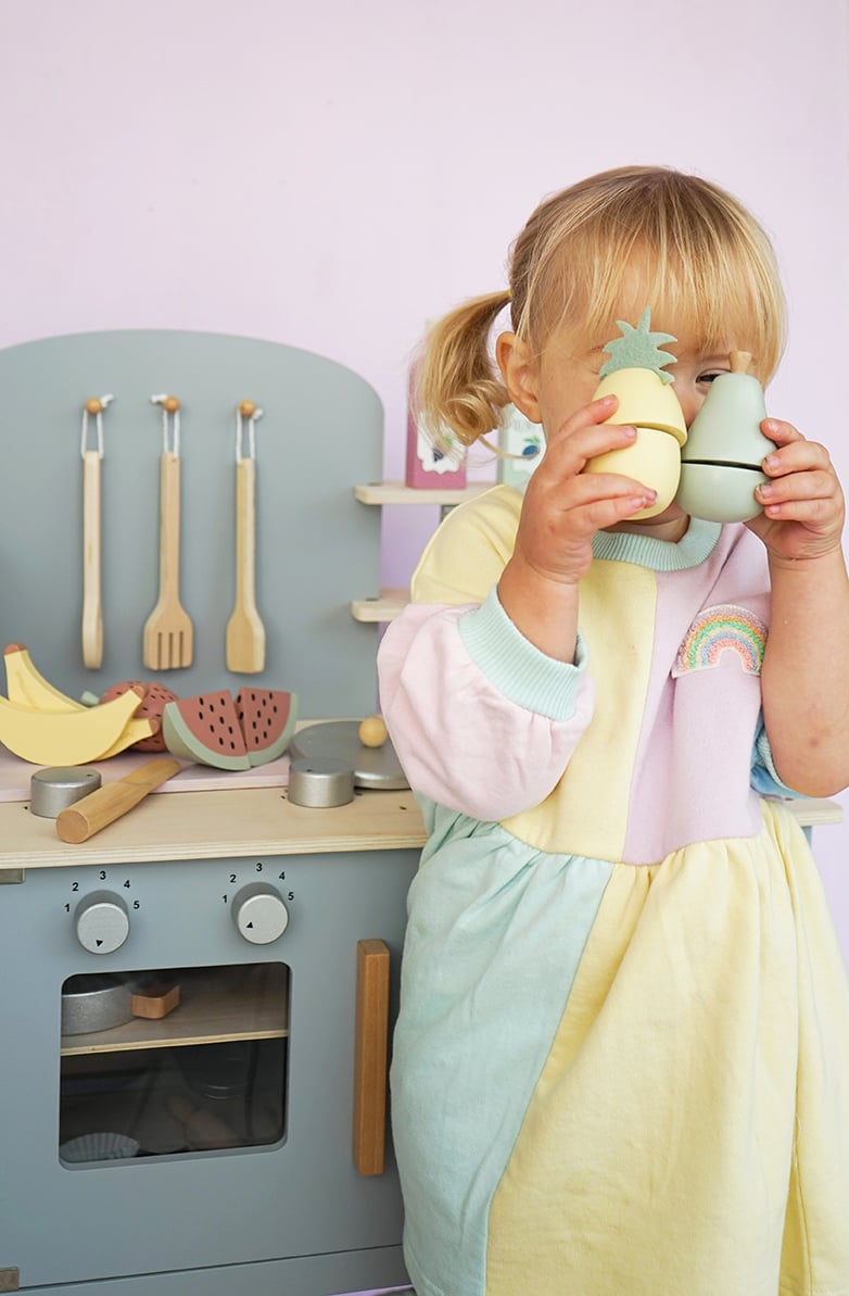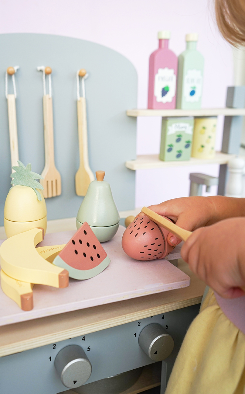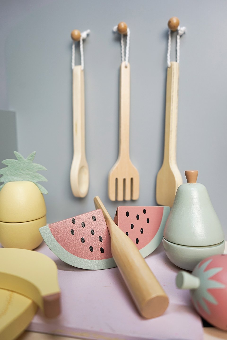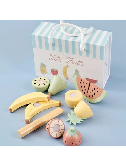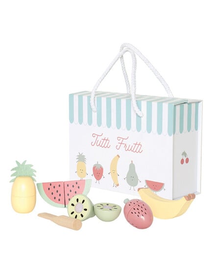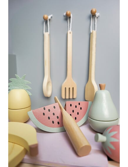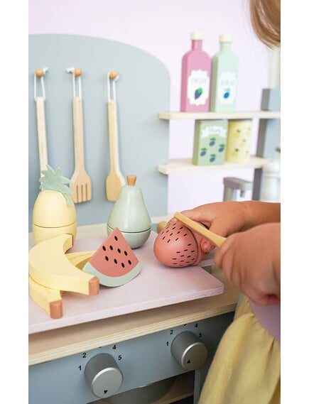 Ετοιμάστε ένα υγιεινό και γευστικό επιδόρπιο με τα φρέσκα και πολύχρωμα φρούτα που περιλαμβάνει το σετ, και απολαύστε τη δημιουργία της πιο νόστιμης φρουτοσαλάτας! Τα φρούτα είναι ενωμένα με Velcro και μπορούν να χωριστούν σε δύο κομμάτια με το ξύλινο μαχαιράκι που περιλαμβάνεται στο σετ.