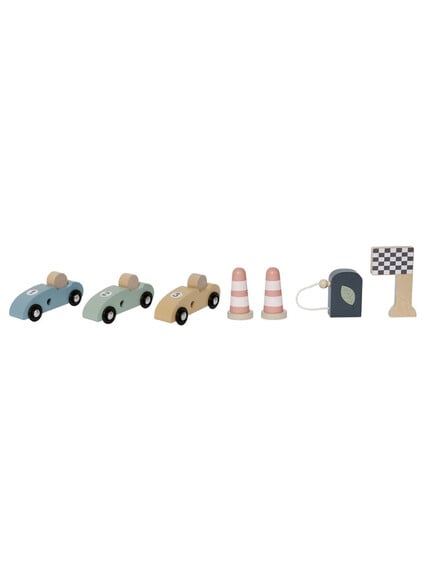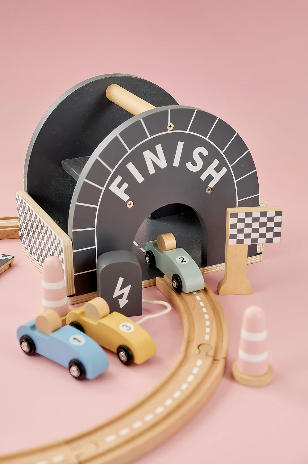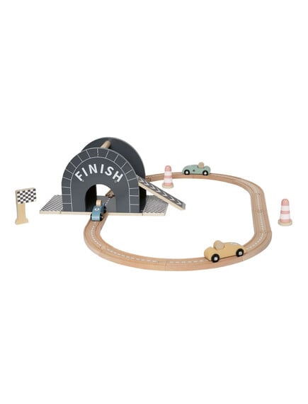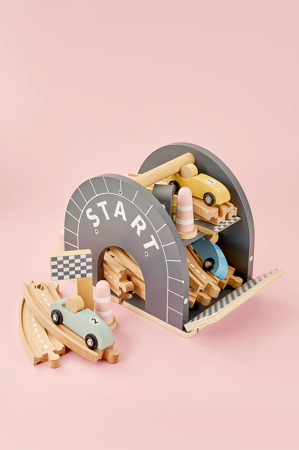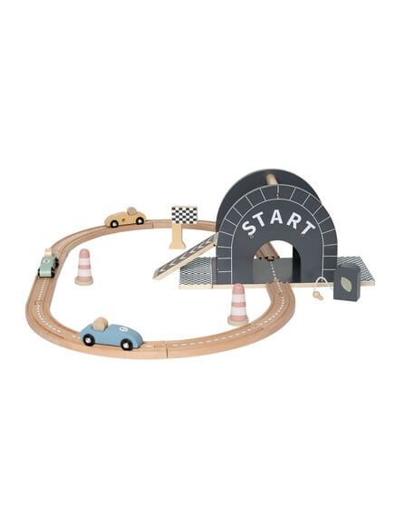 Η πίστα είναι σχεδιασμένη σαν οβάλ σχήμα με ομαλές στροφές, διαγραμμίσεις από την εκκίνηση μέχρι τον τερματισμό και μια εντυπωσιακή ράμπα πολλαπλών επιπέδων, όπου τα αυτοκινητάκια εκτοξεύονται με φόρα. Ιδανικό παιχνίδι για μικρούς λάτρεις της ταχύτητας – είτε πρόκειται για μια φιλική αναμέτρηση είτε για το πιο συναρπαστικό πρωτάθλημα στο παιδικό δωμάτιο!