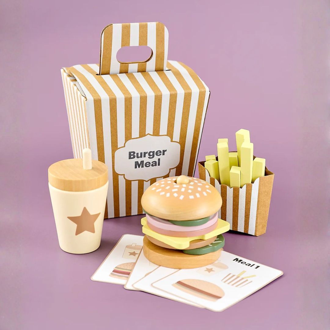 Με το φανταστικό μας σετ burger, τα παιδιά μπορούν να δημιουργήσουν αμέτρητα λαχταριστά γεύματα, εμπνευσμένα από τις κάρτες μενού που περιλαμβάνονται. Το burger είναι στοιβαζόμενο, επιτρέποντας στο παιδί να επιλέξει μόνο του ποια υλικά θα προσθέσει σε κάθε παραγγελία.