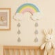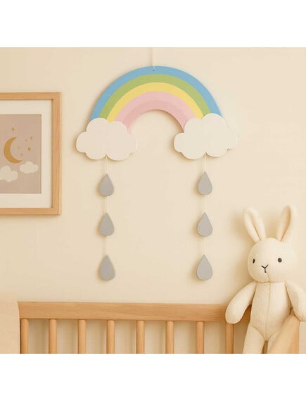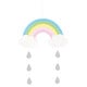 Χαριτωμένο ξύλινο μόμπιλε σε σχήμα ουράνιου τόξου, με κρεμαστά λευκά συννεφάκια και σταγόνες βροχής!