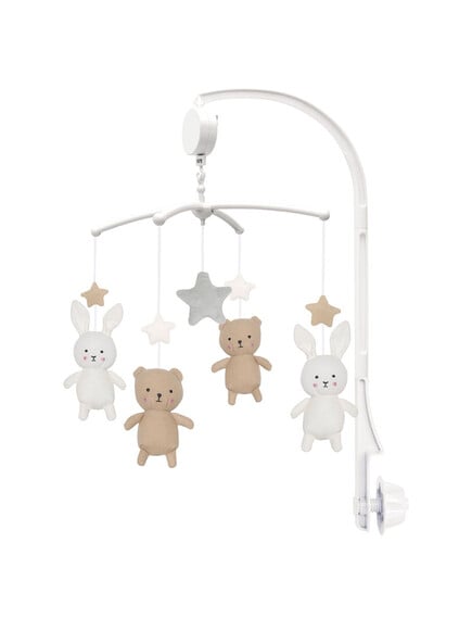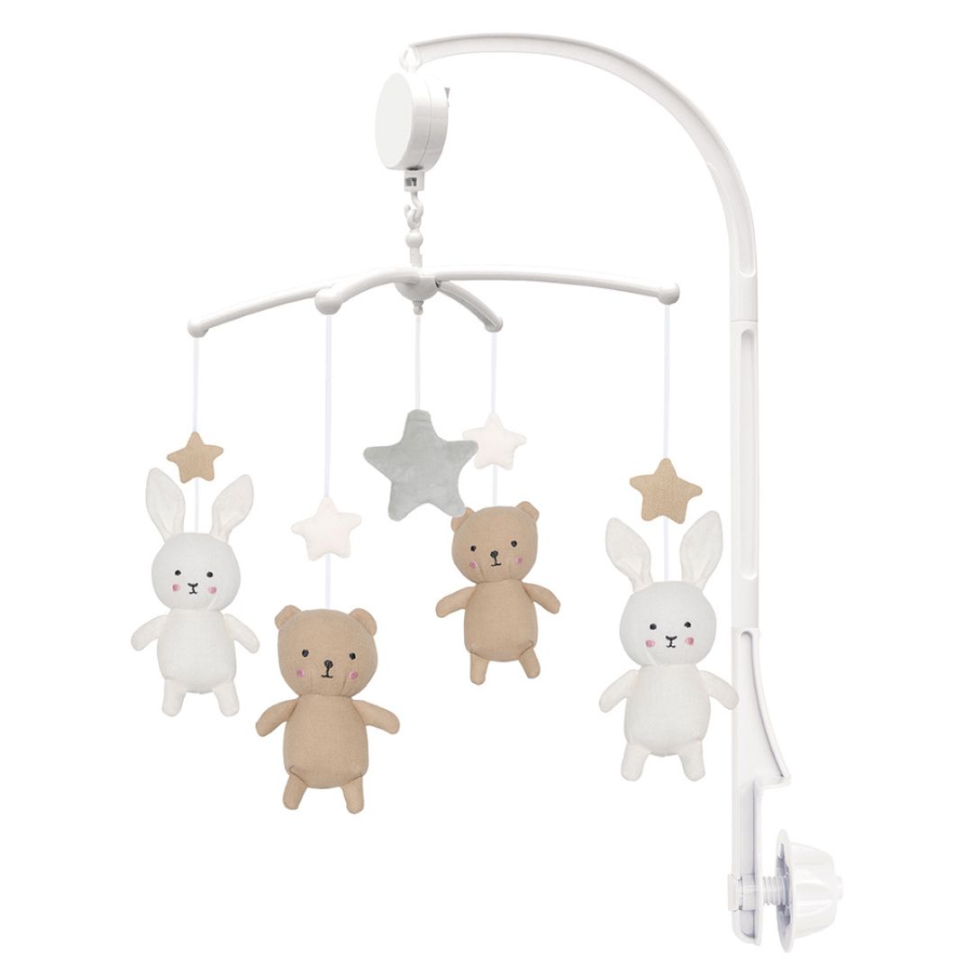 Παίζει μια γλυκιά χαλαρωτική μελωδία καθώς κινούνται τα πανέμορφα αρκουδάκια, λαγουδάκια και αστεράκια που είναι φτιαγμένα από μουσελίνα.