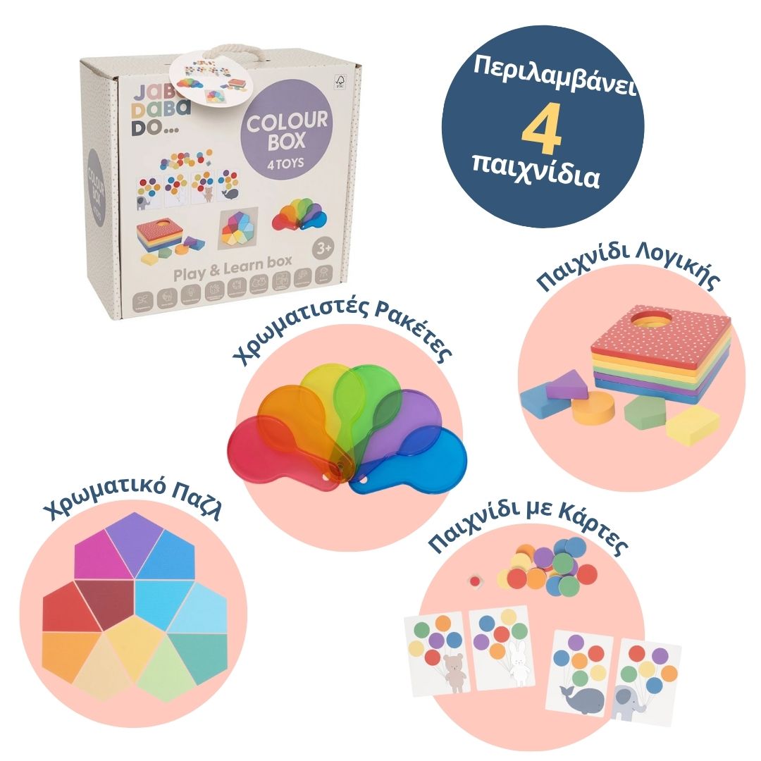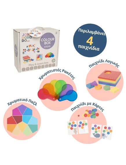 Ανακαλύψτε ένα μοναδικό σετ παιχνιδιών σχεδιασμένο για να κάνει τη μάθηση διασκέδαση! Αυτό το ειδικά επιλεγμένο κουτί περιλαμβάνει 4 συναρπαστικά παιχνίδια που βοηθούν τα παιδιά να αναγνωρίζουν και να κατανοούν τα χρώματα, αναπτύσσοντας παράλληλα σημαντικές δεξιότητες.