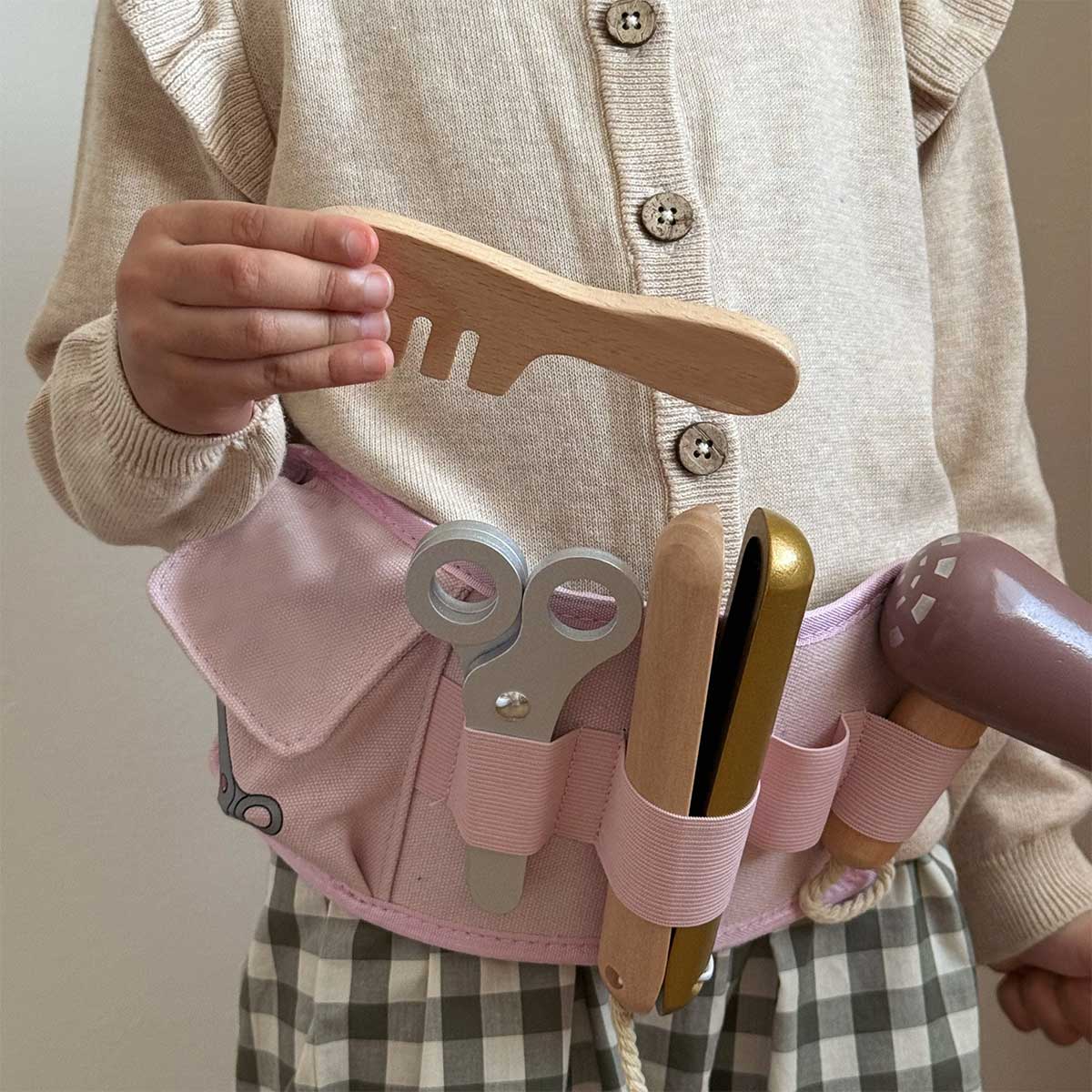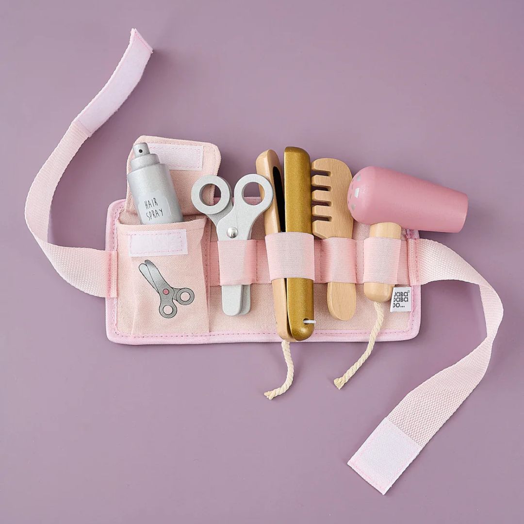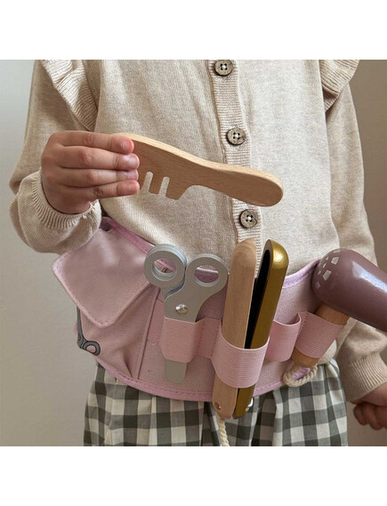 Το σετ κομμωτικής περιέχει: 1 ρυθμιζόμενη ζώνη με κούμπωμα, 1 πιστολάκι μαλλιών, 1 χτένα, 1 ισιωτικό, 1 ψαλίδι και 1 μπουκάλι σπρέι μαλλιών.
