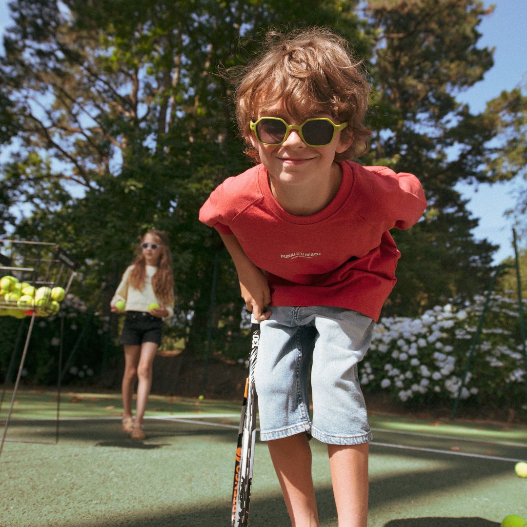 Τα παιδικά γυαλιά ηλίου Eyzz Black της KiETLA ξεχωρίζουν χάρη στο μοντέρνο εξάγωνο τους σχήμα, σχεδιασμένο για παιδιά 4 έως 12 ετών που θέλουν να εκφράσουν το στυλ τους με ασφάλεια και άνεση.