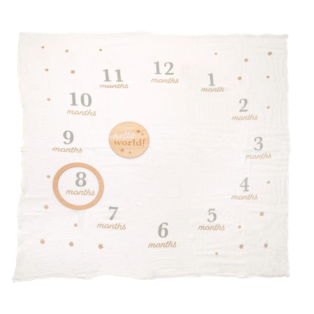 Κάθε μήνας του πρώτου χρόνου του μωρού είναι μοναδικός. Η κουβέρτα αναμνήσεων μωρού Hello World σού επιτρέπει να γιορτάσεις και να καταγράψεις κάθε πολύτιμη στιγμή με στιλ και άνεση. Μαζί με το σετ περιλαμβάνεται και ένα ξύλινο διακοσμητικό, για να δημιουργήσεις ξεχωριστές αναμνήσεις και να τις μοιραστείς με την οικογένεια και τους φίλους.