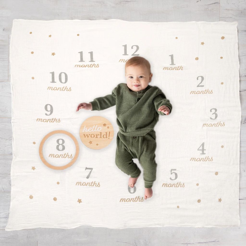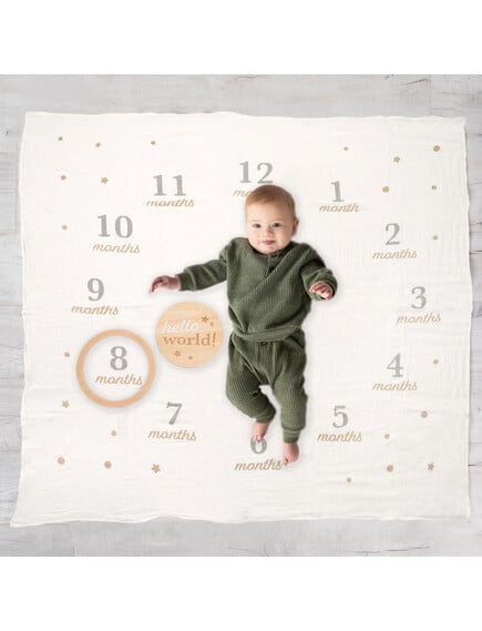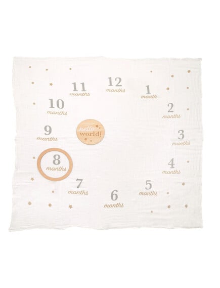 Τοποθέτησε το μωρό σου στο κέντρο της κουβέρτας, ανάμεσα στους αριθμούς από τον πρώτο έως τον δωδέκατο μήνα. Ο μεγάλος κύκλος που σχηματίζεται στο σχέδιο της κουβέρτας και τα χαριτωμένα αστέρια σε απαλή μπεζ απόχρωση δημιουργούν το τέλειο φόντο για οργανωμένες και γλυκές φωτογραφίες ανά μήνα.