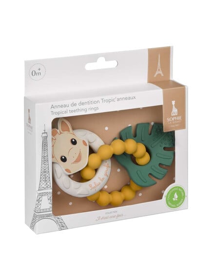 Αποτελούνται από τρία χρωματιστά δαχτυλίδια, με ανάγλυφες επιφάνειες όπως κουκκίδες, φυσαλίδες και μοτίβα που κάνουν απαλό μασάζ στα ούλα. Το ένα δαχτυλίδι είναι πιο μαλακό, με το χαρακτηριστικό κεφαλάκι της Sophie, ενώ τα άλλα δύο είναι πιο σταθερά για διαφορετική αίσθηση στο μάσημα.