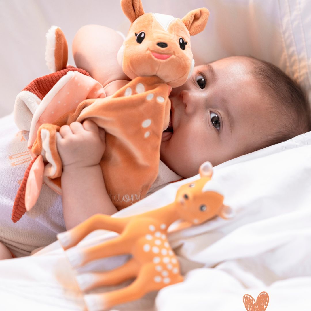 Αυτό το πανέμορφο σετ δώρου περιλαμβάνει τον αγαπημένο Fanfan το ελαφάκι, φτιαγμένο από 100% φυσικό καουτσούκ και είναι ένα ασφαλές και φυσικό παιχνίδι οδοντοφυΐας για το μικρό σας καθώς και ένα πανάκι παρηγοριάς, απαλό σε χρώμα και υφή έτοιμο να αγκαλιάσει και να παρηγορίσει το μωρό σας. Το τσεπάκι που έχει κρατάει την πιπίλα του μωρού καθαρή. Είναι ελαφρύ και εύκολο στο κράτημα. Το μωρό θα το λατρέψει!