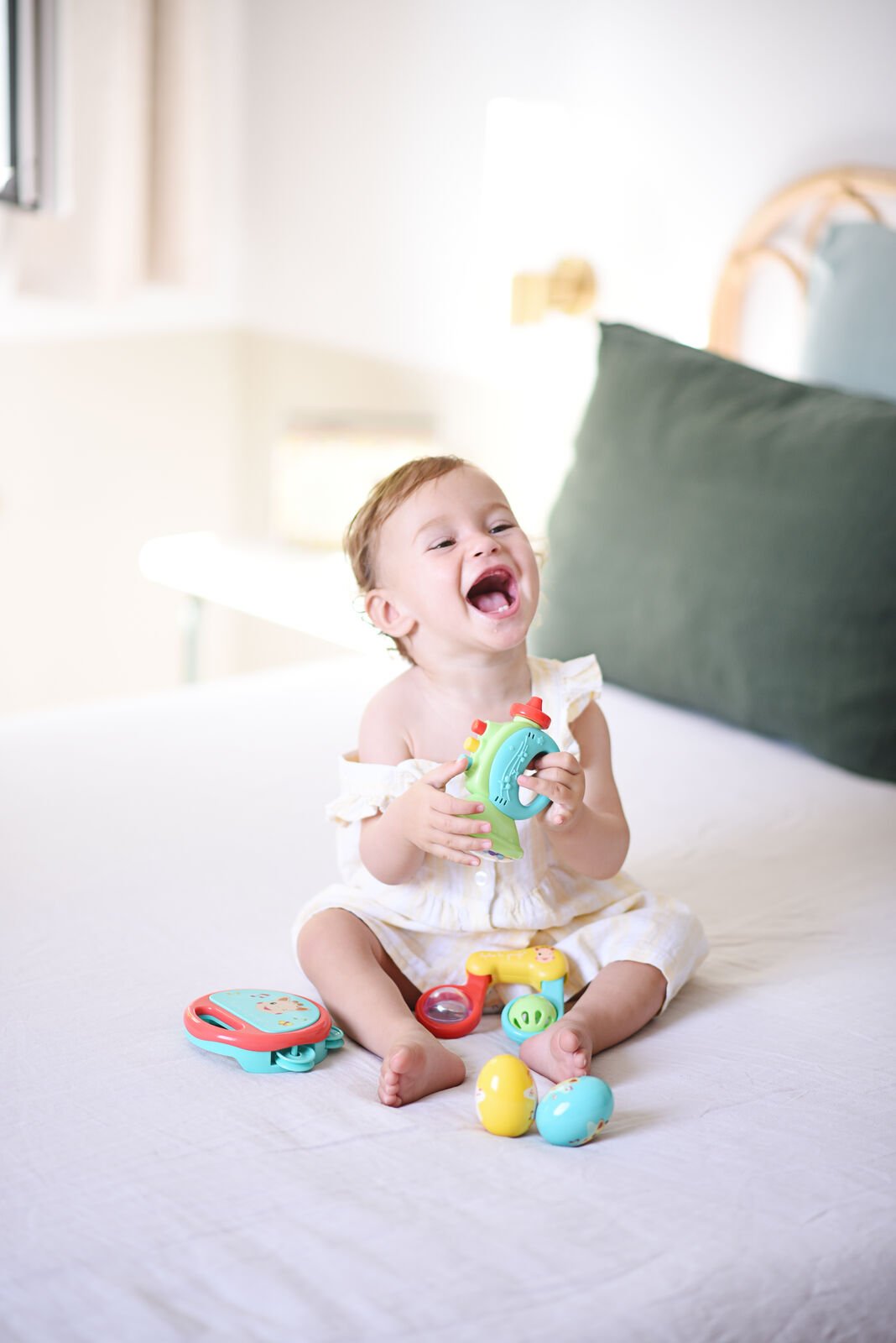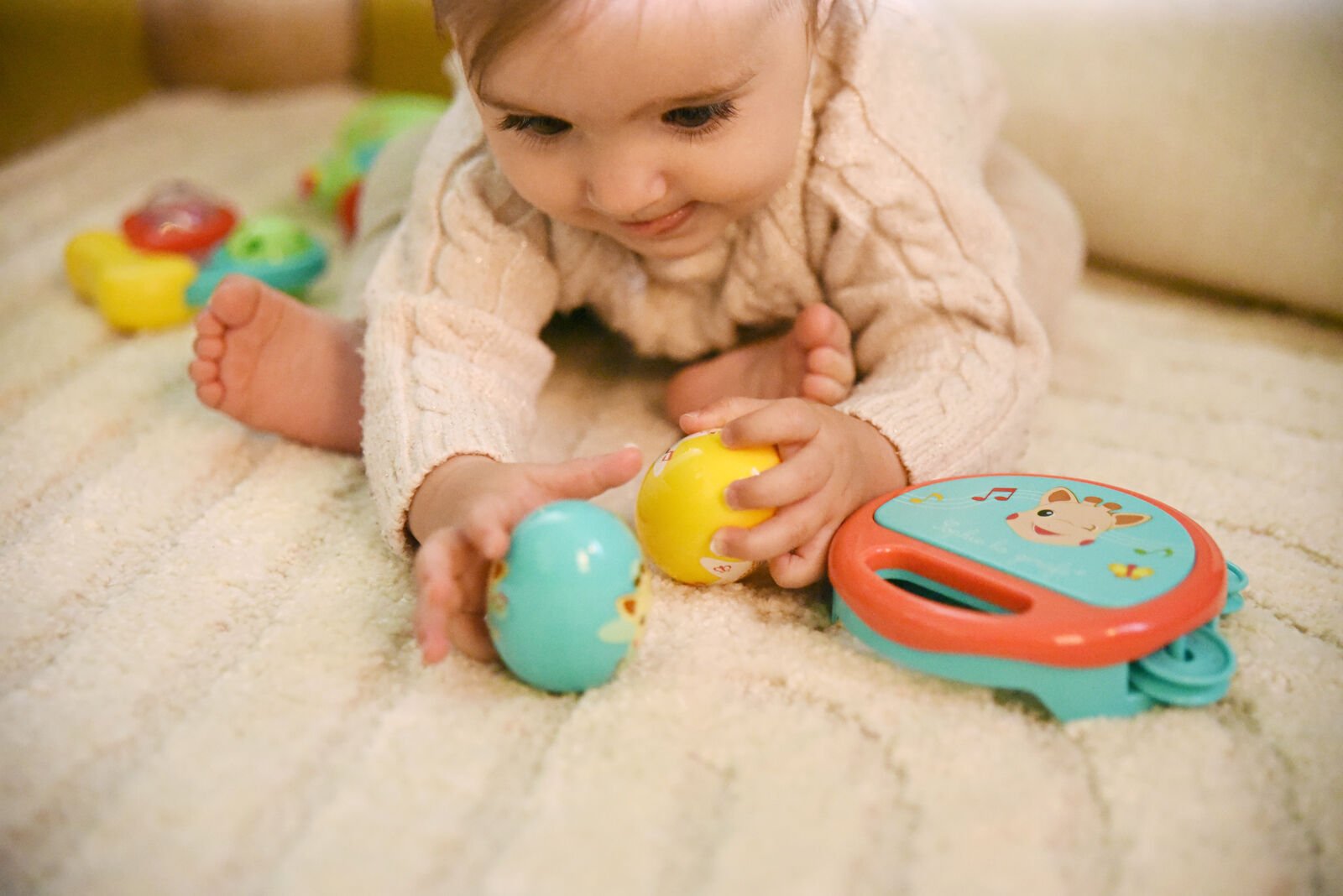 Καθώς το μωρό παίζει, αναγνωρίζει διαφορετικούς ήχους, πειραματίζεται με ρυθμούς και αναπτύσσει τη μουσική του αντίληψη. Παράλληλα καλλιεργεί τον συντονισμό χεριού-ματιού, τη λεπτή κινητικότητα και τη συγκέντρωση — όλα μέσα από φυσικό, ελεύθερο παιχνίδι.
