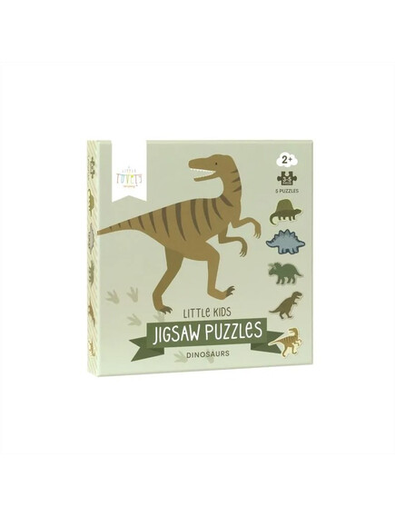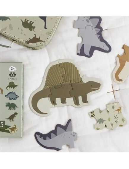 Комплект от пет пъзела "Динозаври", специално за деца на възраст 2+ години. Всеки пъзел с динозаври се състои от 3 до 5 големи парчета пъзел. Частите на пъзела са изработени от дебел картон - идеални за малки ръчички.